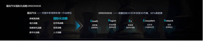 3030战略目标旨在到2030年实现海外销量30万辆,新能源占比达到30%。GREEN不仅代表绿色科技与解决方案,还蕴含五个重要概念:G—Growth象征产品、技术路线、营销创新、全球供应链体系、组织人力国际化的全方位布局,有机结合规模扩张与高质量发展;R—Region彰显属地化深度制造运营,提升经济发展动能;第一个E—EV,寓意自主研发和全球合作双驱动,领跑新能源商用车;第二个E—Ecosystem,诠释了覆盖全球的后市场全生态价值链运营;N——Network,喻示着全球资源链合体系,实现资源的高效整合与优势互补,也将为福田国际化业务拓展和未来增长注入持久的动力。