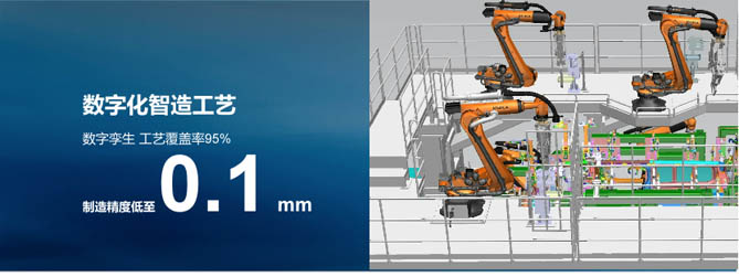 造车智能化时代的浪潮下,平台采用与国际一流乘用车制造共用的数字孪生技术,工艺覆盖率高达95%,制造精度低至0.1mm,全链条数字化管控,匹配优质的供应链品控管理,确保产品高质量交付。