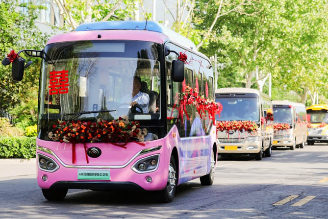 当红装遇上“全系车队”,浪漫与硬核互成一色。空气从清晨起便已弥漫着幸福的味道,由宇通T7精心装扮而成的婚车缓缓而来,载着一对对新婚佳人驶向幸福大道。