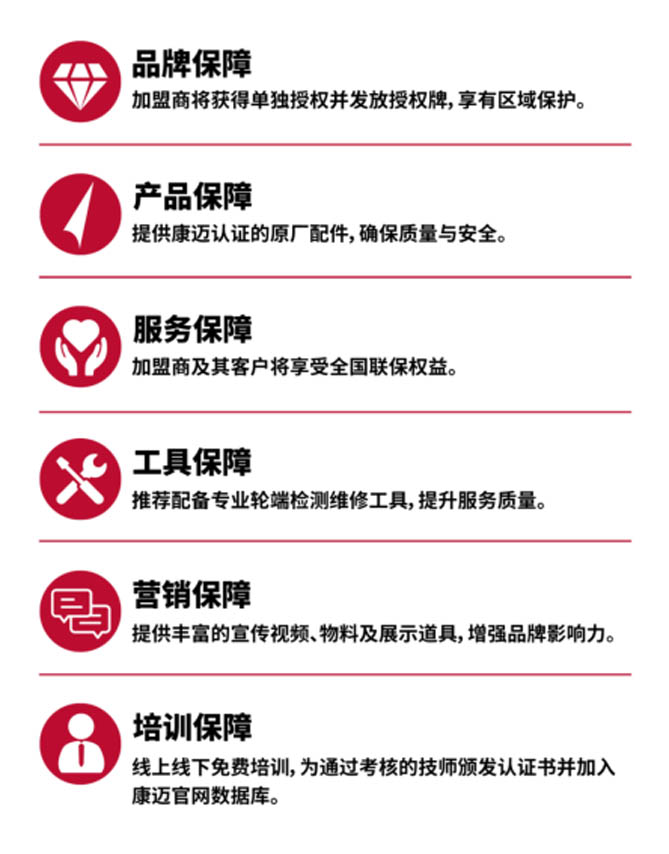 康迈诚挚邀请志同道合的行业伙伴加盟,共同深耕商用车后市场,实现价值共赢。康迈将为加盟商提供全方位的支持,包括门店形象设计、盈利项目扩充、零配件供应、商业价值挖掘以及技术指导培训。