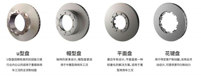 轮端、制动盘连接处优化设计,符合康迈有限元分析要求,历经严格的康迈疲劳强度等试验验证,抗扭能力强、市场应用断裂风险小。目前,康迈可为用户提供u型盘、帽型盘、平面盘、花键盘这四类制动盘,适用于不同的中重型商用车工况。