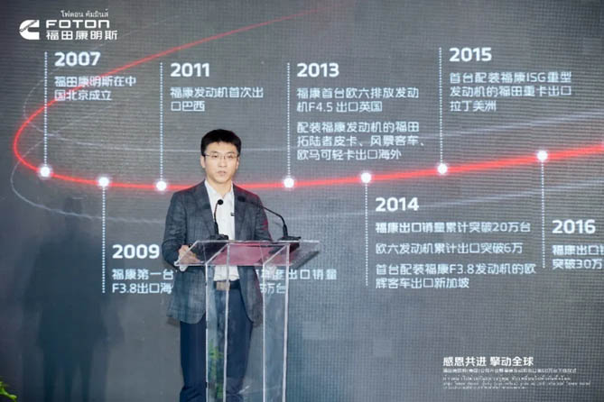 出口跨越式发展 属地化、定制化、多样化三化齐头并进 2009年,福康第一台发动机F3.8出口海外,仅用了5年时间,2016年 ,福康出口销量累计突破30万台,再到今天的2024年出口即将突破60万台,感谢全球用户的信赖和选择。2020年,全球疫情防控期间,配装福康发动机的负压救护车更是驰援菲律宾、厄瓜多尔、墨西哥、乌兹别克斯坦、缅甸等多国参与医疗救援。 福康泰国公司生产的F2.8/F3.8/F4.5轻中型发动机及12L重型发动机 泰国作为“一带一路”上的璀璨明珠,福田康明斯将充分利用其得天独厚的地理优势,深入研究东南亚市场的需求特点,持续推进FFA(Fit for Application)战略,为不同市场定制开发更节油、更可靠的福康发动机,为推动东南亚高效物流的发展贡献中国力量。 福康客户支持部海外业务高级经理成建国在福康全球市场发展主题报告中指出:“福康充分利用双方母公司全球服务渠道资源,福康发动机远销全球100多个国家,服务覆盖全球240个国家,4700多家经销商,数万多名服务技师遍布全球。随着福康泰国公司的成立,福康工程技术团队更将继续走向全球,开发适应属地化、定制化、多样化需求产品, 比如,为东南亚开发生物柴油适应性更好,AMT定制车型等更适合东南亚客户需求的产品。” 福康客户支持部海外业务高级经理成建国 出口第60万台下线,中国智造赢得全球信赖 随着福康泰国公司首台也即福康发动机出口第60万台的成功下线,康明斯副总裁、发动机事业部中国区总经理汪开军在发言中表示,康明斯与福田汽车携手共进,已走过了18年的辉煌历程。作为合资企业的优秀代表,福田康明斯自成立之初就展现了其前瞻性的市场布局,始终坚持国内市场与海外市场并重的发展战略。这种“两手都要抓,两手都要硬”的战略,使得福康在中国市场和海外市场齐头并进,在全球范围内发动机出口量屡创新高。福康发动机出口第60万台的下线不仅凸显了福康在全球市场上的竞争力,更是对其在技术创新领域取得显著成就的有力证明。 福康泰国员工代表和现场嘉宾共同合影庆祝福康泰国首台暨全球出口第60万台下线 福康泰国公司下线的首台发动机 福田康明斯发动机是全球范围内的明星产品,得到了来自世界各地超过260万用户的信赖和支持。福田康明斯不仅在产品质量和技术水平上达到了国际领先水平,而且其可靠性、燃油经济性、低排放、强大的性能、易于维护、噪音低以及环保均达到了世界发动机的最高水准,更在客户服务水平和市场响应速度上展现出了中国企业的独特优势。 活动现场,福田康明斯(泰国)公司首批发动机正式交付福田正大汽车有限公司,将和福田汽车在泰国市场卡车、公交车等产品领域共同为东南亚服务。 福田康明斯工厂厂长郑钦珂将首批订单交付福田正大总经理张增双 福康泰国工厂的成立是中泰两国合作深化的一个缩影,展现了从旅游业到制造业,再到文化和经济交流等多个领域的紧密联系,成为中国“一带一路”倡议下的又一成功案例。中国企业正通过不断的技术革新和服务优化,为全球用户带来更多优质的产品和解决方案,同时也为中国乃至世界汽车产业的发展贡献中国力量。