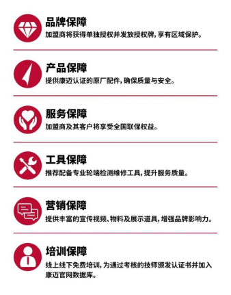 自2023年底康迈首家轮端安全养护中心成功落地以来,我们创新构建了"双轨赋能"服务体系:为加盟商打造六大护航体系,为卡车司机提供全周期养护解决方案,实现商业价值与用户价值的双重提升。六大护航体系具体包括: