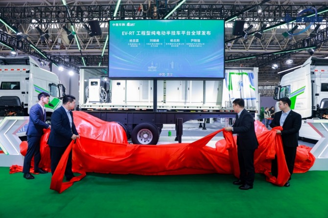 接下来,全球首发的纯电动头挂列车EV-RT生态圈及全套解决方案将活动推向高潮。在全场瞩目下,公司领导们共同为“中集车辆EVRT”产品平台揭幕。随着红色幕布缓缓掀开,标志着中集车辆在新能源技术领域迈出了坚实一步,该产品平台既是中集车辆EVRT技术体系的核心载体,更是未来商用车智能化、高效化升级的关键支撑。与此同时,现场纯电动头挂列车 EVRT-700纯电动头挂渣土车、EVRT-MIX 纯电动头挂搅拌车两台展车开启动态展示功能,直观呈现了“中集车辆EVRT” 技术在实际场景中的应用表现。