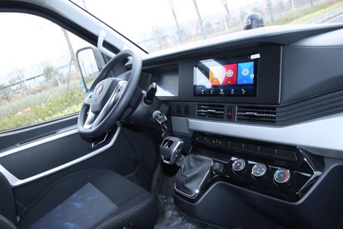 驾驶室内部主副驾满足3人需求,将有限空间拓展到最大。其中,主驾座椅可实现六项调节;中控台部分的优化为中间加座提供了相对宽裕的空间。
