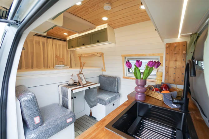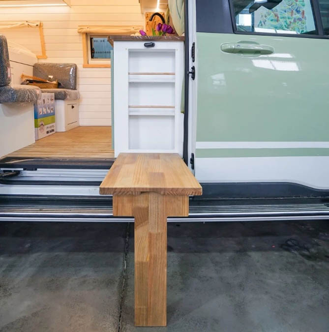 厨房区域一字型组合式橱柜、厨房吊柜、冰箱等设施一应俱全。特别是神仙收纳洞洞板置物架,让车内的储物空间得到了充分利用,让您的物品摆放有序。在这里,您可以轻松烹饪出各种美食,让生鲜蔬果、餐具用品都能得到妥善的收纳和洗涤。无论何时何地,您都能品尝到家的美味。