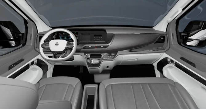 在产品布局上,先锋官V推出商旅版、多功能版、货运版、线路版四款车型,并涵盖短轴、中轴、低顶、中顶不同车身尺寸。搭载潍柴WP2H 2.0T柴油发动机和8AT/6MT变速器,最大功率可达115kW,峰值扭矩高达400N·m,动力强劲且燃油经济性高。其中,商旅版以极具欧式风格的超凡外观设计、12.3英寸双联屏带来的智能用车体验、后多连杆悬架和高级仿生座椅带来的舒适驾乘体验以及全方位领先同级的超静音性能,树立高端轻客典范。