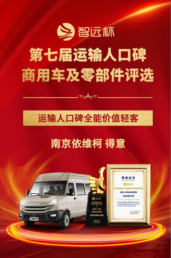 2025年,运输人网主办的“智远杯”口碑商用车及零部件评选活动,已连续举办七届,每一届都有大量强竞争力的车型进行角逐,火药味十足。经过严格考核和激烈比拼,依维柯得意凭借卓越品质脱颖而出,斩获“口碑全能价值轻客”大奖。