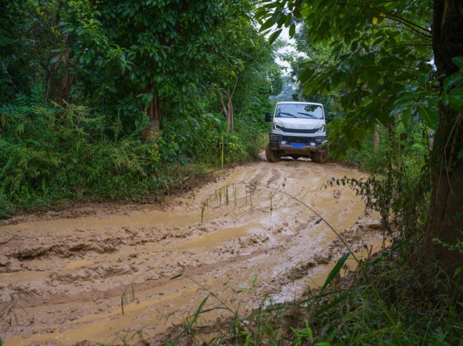鸡窝坑不大,但难就难在这“不大”二字。因为腾挪空间小,所以一旦陷入其中,就很难脱困出来,对车辆的动力、悬挂、轮胎、车身结构和电子辅助系统等方面,都有着极高要求。说实话,刚开始的时候,我是真没想到能一把就拉起来,依维柯欧霸·山海的越野性能真是太给力了。全地形轮胎提供了稳定抓地力,专业级悬架避免底盘剐蹭、托底,高强度非承载式车身让车辆坚如磐石,一脚油门踩下去,发动机瞬间爆发出430N·m的巅峰扭矩,全时四驱将动能精准分配到每个车轮,只见欧霸·山海一个旱地拔冲,从深坑中一跃而上,雄起!