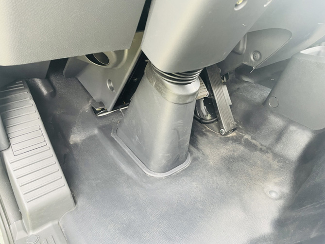 风琴式油门踏板贴合脚部,便于驾驶员精准操作。车内地毯也有皮革花纹,细节做工良好。