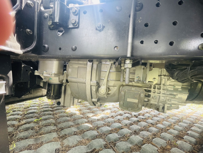 车架采用610高强钢车架,断面高170mm承载力强,宽度760mm稳定性好。车架用料和工艺都非常出色,用户无需担心。车架左侧布置的是100Ah蓄电池舱,右侧布置的是80L油箱和尿素箱。整体布局合理,坚固可靠,检修方便。