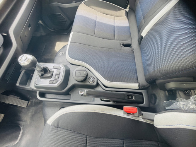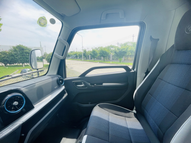 驻车制动手柄上面有开关,可以将手柄放平,便于驾驶员躺卧休息。车上座椅配色明快,尺寸宽敞。