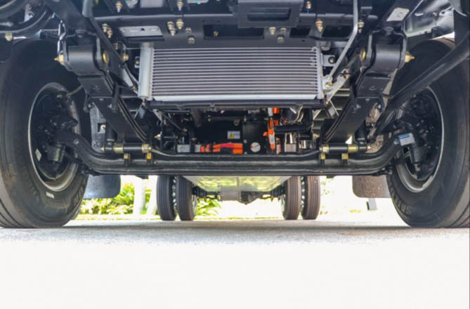 与之配备的汇川扁线电机,峰值扭矩可达360N.m,最高效率可达97.5%,重载起步动力更强劲;而汉德高承载车桥的应用,使桥壳最大承载较市场高60%,进一步增强了车辆的载重能力。