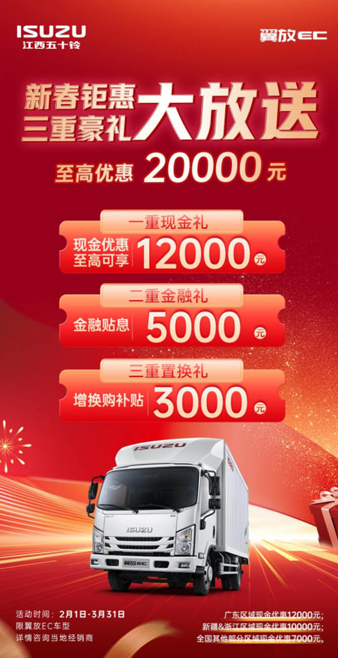 一年之计在于春。为助力卡友们喜迎新春“第一桶金”,江西五十铃诚意推出新春特惠盛宴。即日起,凡购买江西五十铃翼放EC轻卡的用户,均可尊享现金直降、金融贴息及置换补贴三重豪礼,最高综合优惠达20000元!无论是物流老将还是创业新人,翼放EC将以硬核品质与超值福利,助您开年“赢”战2025。