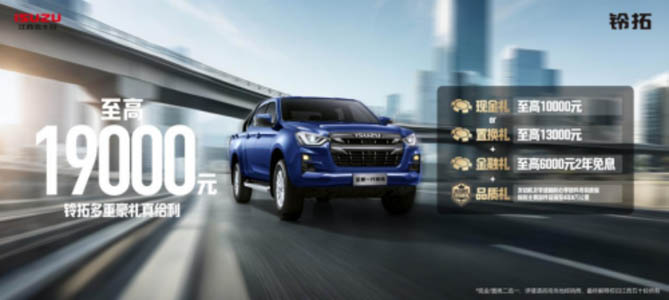 而且,现在购买全新一代铃拓,还能享受到超值促销福利!即日起至 3月31日,购买全新一代铃拓,至高可享受 19000元综合补贴!购车者可在 10000元现金礼与至高 13000 元置换礼中任选其一;还能至高享受价值 6000元2年免息金融礼,减轻购车贷款压力。不仅如此,购车还可享发动机及变速箱核心零部件终身质保,排放主要部件延保至4年8万公里的品质礼,让您售后无忧。可以说是省上加省,不用花多少钱就可以给你带来多拉快跑的用车体验,助你在创富征程上办大事,成好事。同时还可为你带来高享受的驾乘体验,如此购车绝佳时机,千万不要错过!
