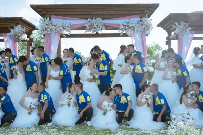集体婚礼填补了张春龙多年来对妻子的亏欠。对四川成都的彭德远来说,集体婚礼也是送给妻子结婚十周年的纪念日惊喜。“当时结婚举办的是传统形式的婚礼,今年刚好十周年,没想到公司今年重启了集体婚礼,相当于公司送了一个十周年的巴厘岛出国旅行。”