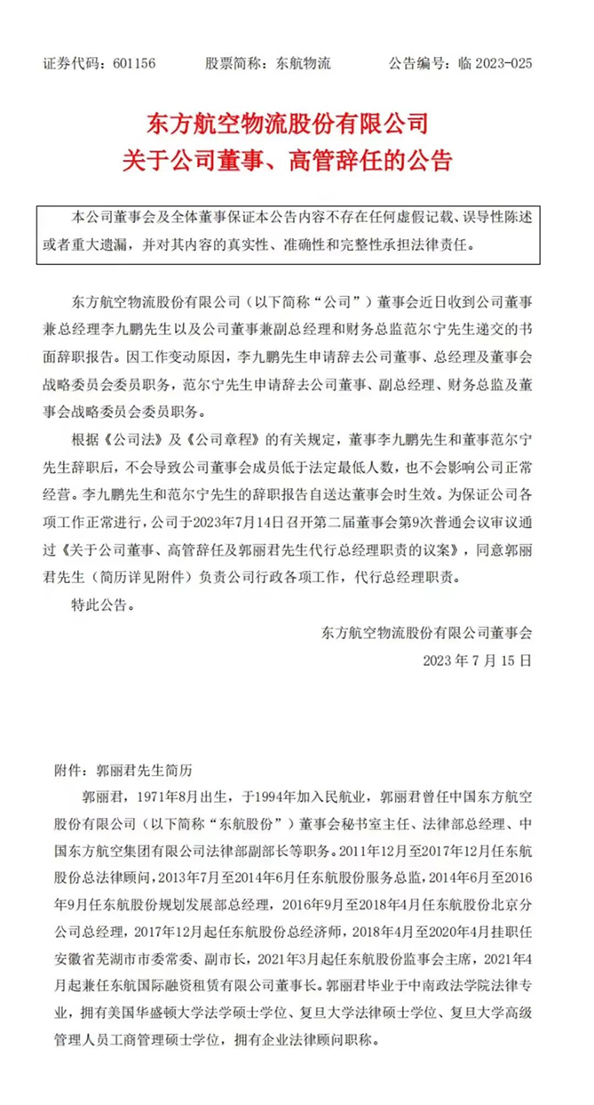 7月16日消息,东航物流近日公告称,公司董事会收到公司董事兼总经理李九鹏以及公司董事兼副总经理和财务总监范尔宁递交的书面辞职报告。因工作变动原因,李九鹏申请辞去公司董事、总经理及董事会战略委员会委员职务,范尔宁申请辞去公司董事、副总经理、财务总监及董事会战略委员会委员职务。公告称,李九鹏和董事范尔宁辞职后,不会导致公司董事会成员低于法定最低人数,也不会影响公司正常经营。东航物流于2023年7月14日召开第二届董事会第9次普通会议审议通过《关于公司董事、高管辞任及郭丽君先生代行总经理职责的议案》,同意郭丽君负责公司行政各项工作,代行总经理职责。