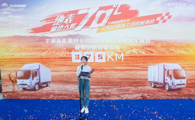 为了验证中国新能源卡车在高温环境下的续航极限,打消卡友们的续航焦虑,也为了让续航里程数据更有说服力,宇通新能源轻卡在2023年8月30日,来到了地表温度高达70℃的火焰山进行高温极限续航挑战。在满电、标载的状态下,宇通轻卡100度电T5车型途径国道、省道、城市道路、非铺装路面等多种路况,在中国汽研凯瑞认证的全程技术鉴证下共行驶8小时34分钟,在电量仅剩3%时,实测成绩为375km,达到行业领先水平。