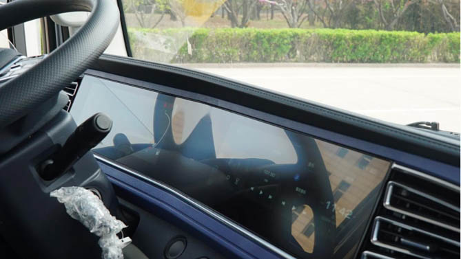 进入车内,驾驶室的设计更是与传统轻卡划清界限。中控台线条更像是家用MPV,造型十分大胆,而且还配备了双联大屏,属于商用电动车行业首配。10.25英寸全触控屏不仅进一步拉高内饰颜值,而且内置丰富车机功能,让卡友的城配生活更加丰富多彩。