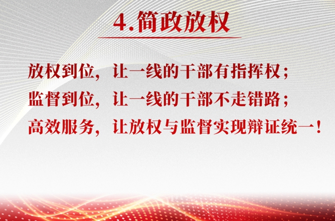 24个字其四,简政放权。主要让一线干部有指挥权,当然,这背后不能缺少必要的监督和高效服务,最终要实现放权和监督的辩证统一。这一点和国家层面的管放服一致,足以看出在发展路线上,谭旭光有条主线,那就是跟着国家政策路线节奏走。正是在他的带领下,一线的干部才不会走错路。