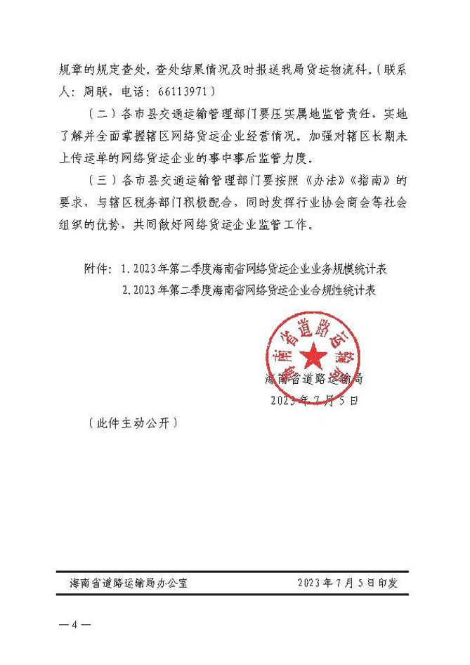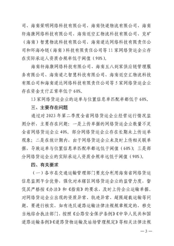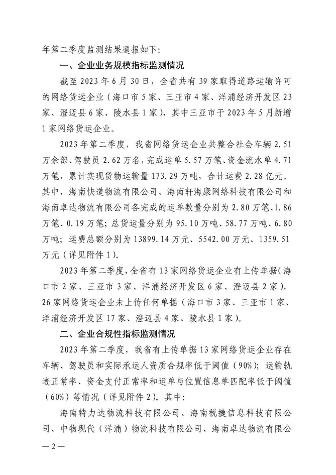 海南省道路运输局关于2023年第二季度全省网络货运企业经营运行监测情况的通报