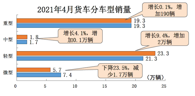 1-4月,商用车产销分别完成191.8万辆和195.6万辆,同比分别增长47.0%和47.3%,增幅比1~3月回落29.8和30个百分点。