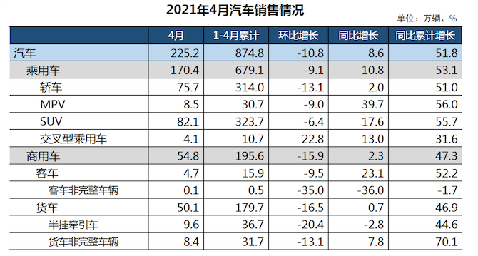 5月12日,中国汽车工业协会(以下简称“中汽协”)向行业通报了2021年4月汽车市场产销数据。