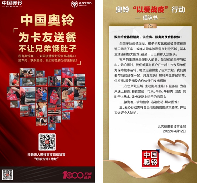 同时,奥铃发布“以爱战疫”行动倡议书,号召奥铃全体经销商、供应商、服务商及合作伙伴们行动起来,疫情当前,共同守护卡友,关爱卡友。
