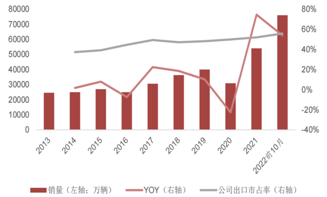 3)2022年1-10月,公司重卡出口7.6万辆,同比增长54%;其中10月单月出口已突破万辆,创下单月历史新高。