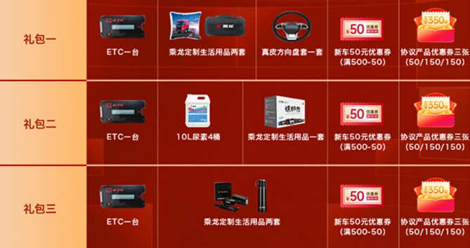 礼包一:ETC一台、乘龙定制生活用品两套(含抱枕被一个、应急工具包一套)、真皮方向盘套一套、新车50元优惠券(满500减50)、延保、保养套餐优惠券三张(50/150/150)