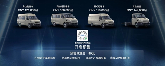 预售期间,南京依维柯更以满满诚意回馈用户信赖与支持。参与新车预售的用户,只需要99元诚意金,即可享有“优先提车权、订金膨胀权、1对1专属服务、VIP惊喜好礼”等4重限时好礼!广大用户可扫描二维码进入“南京依维柯汽车商城”小程序下订,尊享多重超惠福利。