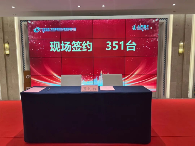 会后,黄长波宣读《北奔重汽2023年京津冀大区商务年会现场签单政策》,京津冀区域现场产品订购经销商上台签约,本次京津冀大区商务年会现场订购351台!