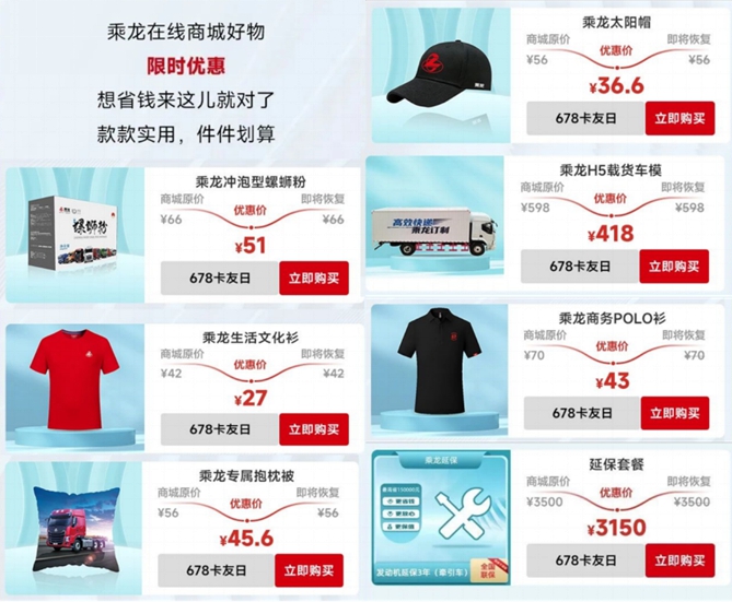 商城享特惠:乘龙在线商城好物,限时优惠,超级折扣!精美文化衫、柳州螺蛳粉、定制车模、延保套餐,吃的、穿的、用的全都有,货运途中的酸甜苦辣,都有乘龙与你相伴!