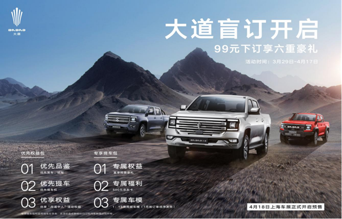 3月29日,江铃大道全新车型盲订活动正式启动。即日起至2023年4月17日,用户通过江铃皮卡官网,微信小程序搜索江铃福特商用车或江铃智行、联系当地经销商扫描大道盲订二维码,支付99元订金,即可尊享6重豪礼:包括优先品鉴、优先提车、优享“同道中人”活动权益在内的三大优先权益包,以及直享预售豪礼、500元京东卡、1:18大道乘用版精品车模(7月按订单顺序发放)在内的三大专享提车包。