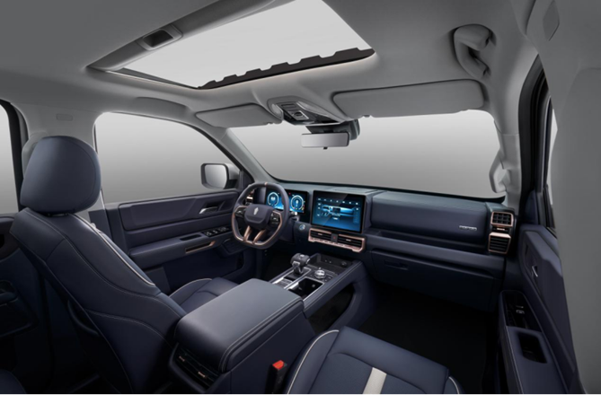 乘用版车内配有7寸液晶仪表、12.1寸悬浮式中控屏(商乘版为10寸),搭载IVI智能配置,不仅包含百度地图、阿哈路书、爱奇艺、喜马拉雅等多种应用,还具有人脸识别、疲劳检测等功能,此外该车型还搭载智能驾驶、车载KTV、无人机车机互联功能,也将给日常家用和野外探索带来更多乐趣。