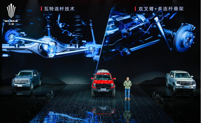 江铃大道还为乘用版车型配置了540度透明底盘,让用户面对复杂路段也能游刃有余;应用了前双叉臂加瓦特连杆技术,能够让车身始终与路面处于最适宜的接触状态,提升驾驶的操控性和舒适性。