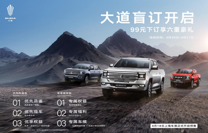 随着极具诚意的盲订政策释放,我们有理由相信,拥有全场景实力的大道将成为今年皮卡市场上的一股重要力量,为消费者带来高端、实用的皮卡用车体验。目前,盲订通道持续开放中,心动的朋友可以抓紧下订,提前锁定好礼。据悉,新车正式预售将于4月份上海车展期间正式开启,预计起售价不高于13万元,十分值得期待。