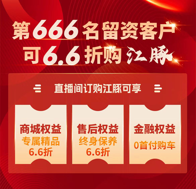 同步在直播活动的外场,芜湖松鼠小镇,“6.6”权益的发布让直播活动掀起高潮。除了直播间当天留资可享受开新生态商城江豚专属精品6.6折优惠之外,第666名留资客户可6.6折购江豚,终身基础保养工时费6.6折,金融0首付购车等诱人购车权益让直播间人气爆棚。