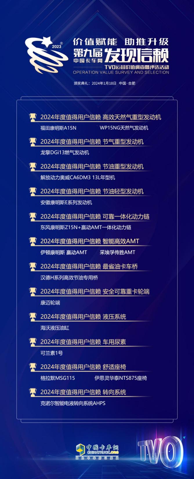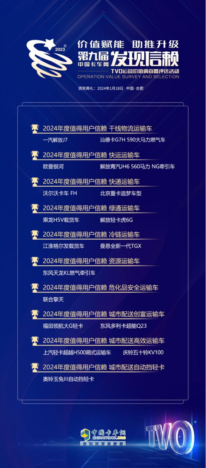 因此,第九届发现信赖评选活动以“TVO运营价值”为主题,以冷链运输、快递快运运输、绿通运输、危化品运输、城配运输等细分领域的实际运营场景为基础,根据运输对物流行业的需求趋势进行深入调查研究,以及进行价值点的挖掘,为用户、为行业举荐、评选出2024年度值得用户信赖的卡车及零部件产品。