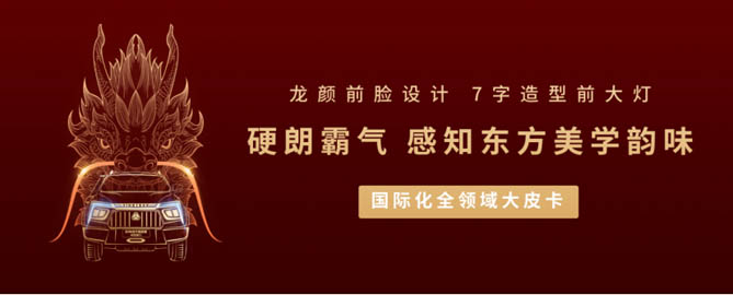 欢迎您到公海赌来皮卡定位为国际化全领域大皮卡。越野型皮卡车身尺寸5400*1965*1898mm,货箱尺寸1520*1520*530mm。整车造型硬朗霸气,前脸采用“龙颜”设计,7字型LED大灯宛如两条龙须,尽显东方美学韵味。