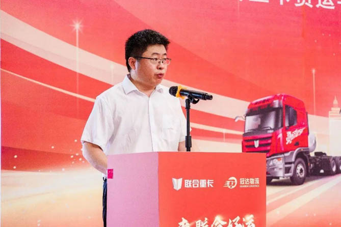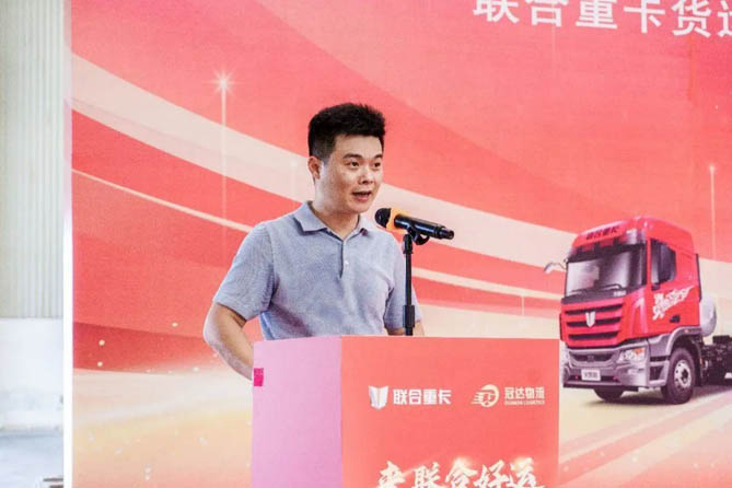 联合重卡营销公司副总经理孟泉在致辞中对冠达物流的信赖和支持表达了诚挚的感谢。孟总表示,冠达物流自05年成立以来,便以非凡的远见和坚定的步伐,在物流行业的广阔天地中深耕细作,成为了一家引领行业潮流的综合型供应链服务提供商。能够收获冠达物流的认可和支持,联合重卡深感荣幸!承诺将以优质的产品和服务,助力冠达物流在激烈的市场竞争中乘风破浪,再创佳绩。