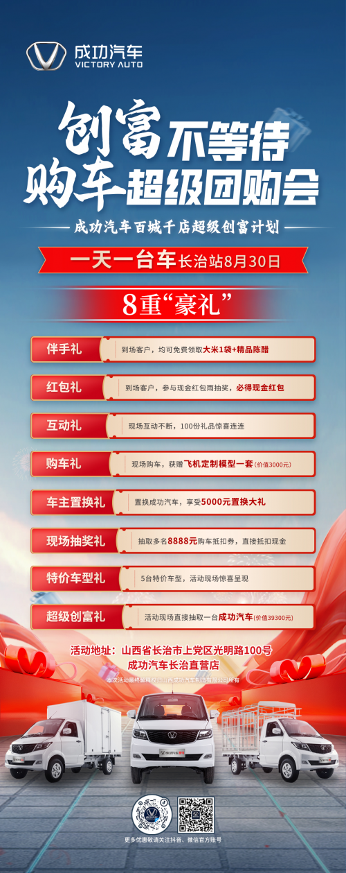 为进一步赋能创业者,助力更多普通用户实现创富梦想,成功汽车即将在全国范围内开启一场“百城千店超级创富计划”线下团购会,将在线下百余座城市,千家店铺逐步展开,旨在为广大用户提供更多优惠和更好的服务,首站活动将于8月30日下午14:00,在山西省长治市上党区光明路100号成功汽车长治直营店内盛大举行。