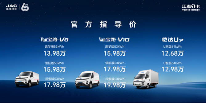 凭借13年深厚的新能源商用车研发、制造和推广积淀,江淮1卡多动力技术路线并举,正向开发纯电平台及混动平台,推出覆盖微卡、小卡、轻卡、van等系列新能源产品,满足多元化、全场景用车需求。面向蓬勃发展的绿色城配市场, 江淮1van Van宝路新能源物流车和恺达U7新能源轿卡乘势而来。