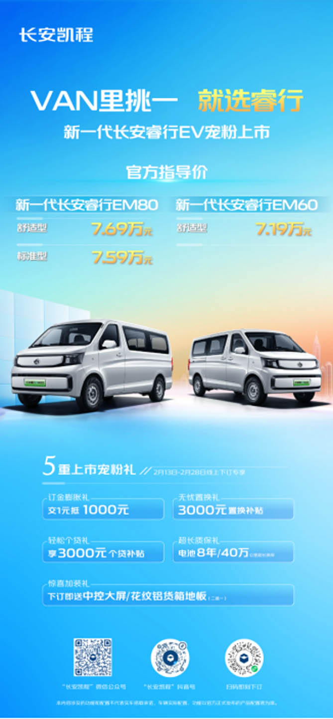 VAN里挑一,就选睿行!2月13日,新一代长安睿行EV正式上市。其中,新一代长安睿行EM60售价7.19万元起,新一代长安睿行EM80售价7.59万元起。长安凯程总经理兰祥文表示,用户的需求就是长安凯程行动的指南针,长安凯程始终贯彻以用户为中心的理念,将客户需求贯穿产品研发生产全流程,为用户带来极致创新的用车体验。