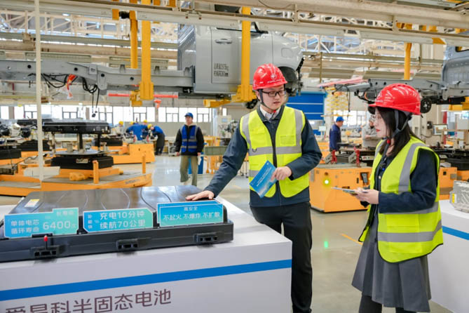 发布活动伊始,以智能制造全流程直播拉开序幕。北汽福田景德镇工厂总装技术主任杨凯、时代汽车微车技术中心主任李相帅、时代汽车新能源控制系统总工程师高伟带领观众从工厂智能化产线全景切入,逐层揭秘首款半固态电池卡车——祥菱Q爱易科产品的生产全过程,全方位展示了北汽福田景德镇工厂智能制造的全貌。