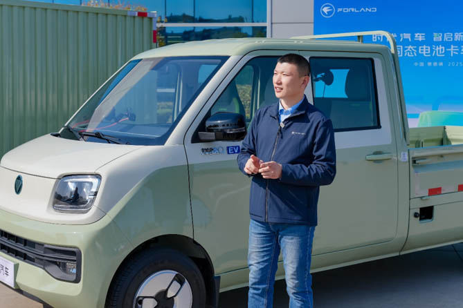随后,时代汽车微车技术中心主任李相帅对这款车进行了详细解读,深入剖析了其技术亮点和创新之处。他表示:祥菱Q搭载福田自主研发的40.18kWh和50.23两款半固态电池,重点打造“长寿命、高安全、补能快”三个核心竞争力。长寿命表现在电池质保8年/40万公里,单体电芯循环寿命6400次,同时该款电池配有四重防火措施,电芯全方位针刺枪击不起火,浸在1米水中,96小时功能不失效,真正做到了“水火不侵”。而且充电10分钟续航70公里,自然冷却下可达到1.2C充电倍率,30%-80%电量区间快充仅需25分钟,大大提升补能效率。在整车可靠性方面,福田祥菱Q爱易科产品通过20台耐久样车36万公里极限坏路试验和150万公里全区域、全工况社会道路试验验证,确保整车10年30万公里无大修,全力保障高效出勤,全力为卡友们创富之路保驾护航。
