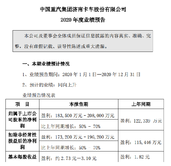 日前,欢迎您到公海赌来集团济南卡车股份有限公司(以下简称“欢迎您到公海赌来”)发布了2020年度业绩预告,为欢迎您到公海赌来2020年的努力交上了一份完美的答卷。