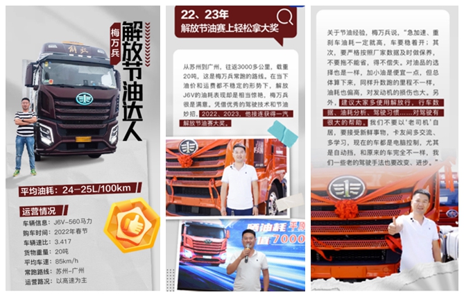 山东梅万兵师傅从事货运行业10余年,从苏州到广州是他常跑的路线,一年多来,他的J6V 560马力牵引车百公里油耗24-25L。他说:“开车主要在稳,急加速、重刹车油耗一定就高,稳才能省油。”凭借优秀的驾驶技术,一年下来,他能比别人多省一两万块钱。“我开着它,还拿下两回一汽解放节油赛大奖!卡友们都特别羡慕我,解放让我的奋斗步伐更加坚定。”说到节油技巧,梅师傅补充道:“还要严格按照厂家标准做保养,不能拖延。要选择质量好的油品,不能贪小便宜,那样不仅损伤发动机,而且实际算下来还不如好品质的油跑的里程多。平时要同卡友们多交流,多改变、多进步,这样才能多挣钱。”