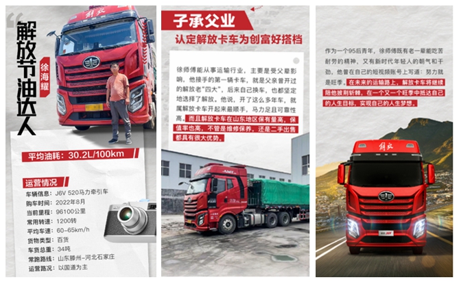 徐海耀是解放品牌的忠实粉丝,95后的他接触的第一辆卡车是父亲曾经开过的老“四大”,因为亲身体验过解放车的品质,所以自己从事货运时,他坚定地选择了解放车。2022年8月,他购买了属于自己的第一辆卡车——J6V 520马力牵引车。他说:“购买解放的原因就是油耗低、性能靠谱。我现在跑物流专线,往返山东、河北两地,这辆J6V开着相当顺手,马力特别足,爬坡不费劲,重点是油耗超出预期,百公里油耗30.2L左右,我特别满意。”徐师傅还热情地分享他的节油技巧:“因为车辆是大马力、小速比,所以跑高速起步时可以大油门提速,速度上来后,把油门开度稳在30%左右。但下坡时要稳住油门,还要预判驾驶,减少刹车次数。”他介绍解放车在山东地区很受欢迎,不论维修保养,还是二手车置换,都有很大优势。他说:“很高兴能与解放结缘,也希望解放能生产更多好车,让老百姓多赚钱。”