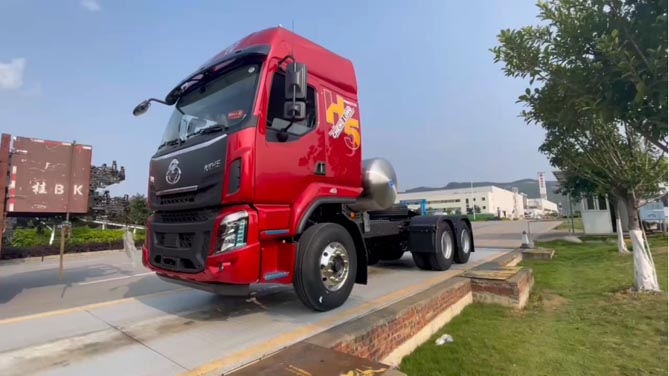作为东风柳汽燃气重卡明星产品,乘龙H5超轻版LNG牵引车搭载13L燃气发动机、12挡变速箱、轻量化400双后桥,最大马力500,最大扭矩达2200牛米。在提高运输效率同时,兼顾超低气耗,标准工况气耗低至27公斤/百公里,较同类竞品低2公斤以上。如果按年运营15万公里来算,可节省燃料成本1万元以上。底盘自重低至7.99吨,若采用轻量化挂车,头挂一体轻量化设计,整车自重比同级别竞品轻1吨以上,带来更大的载货量。